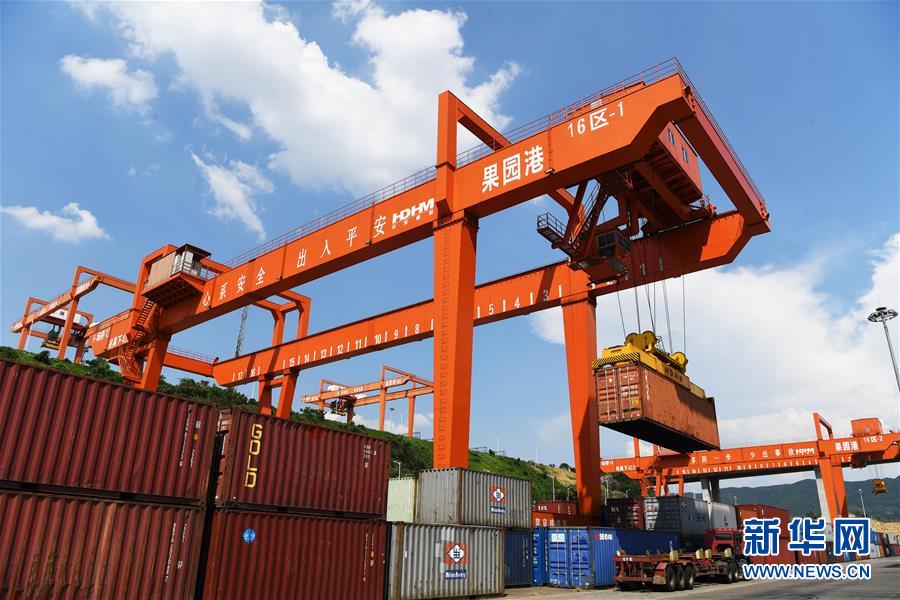 8月20日,一辆运载汽车的货车行驶在重庆果园港内。