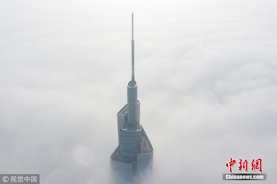 11月26日,南京出现大雾天气,当地气象台发布大雾红色预警信号,450米高的南京紫峰大厦在浓雾笼罩下鹤立“楼”群,恍若仙境。