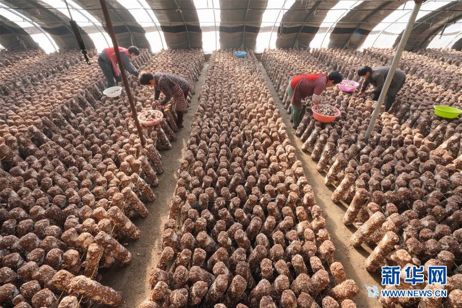 12月20日,唐山市丰润区小美食用菌种植农民专业合作社社员在大棚内采摘香菇。