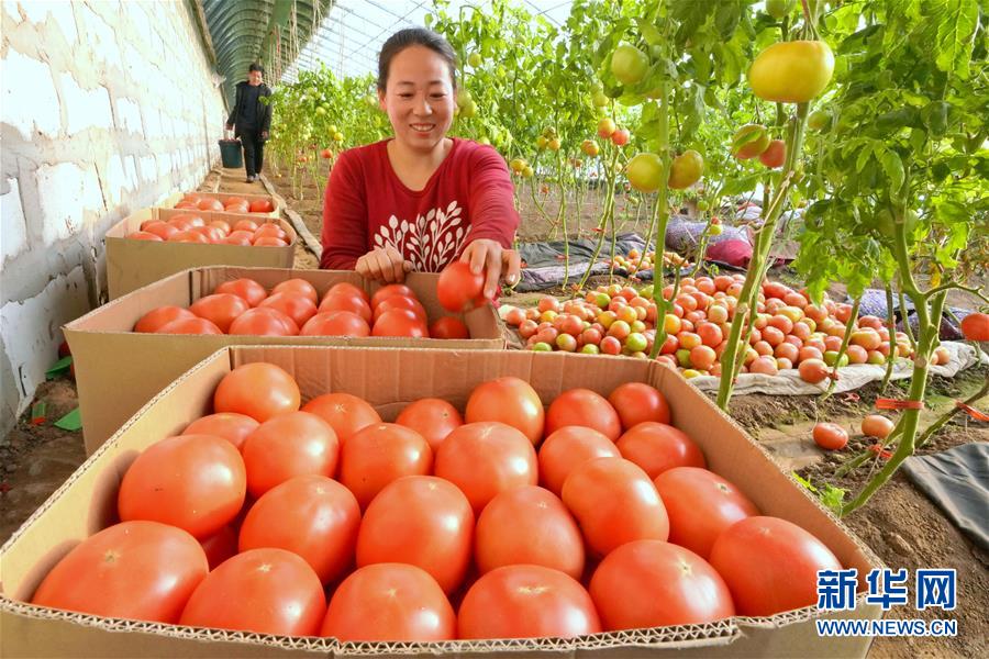 12月20日,唐山市丰润区百草坡农产品农民专业合作社社员在大棚内收获西红柿。