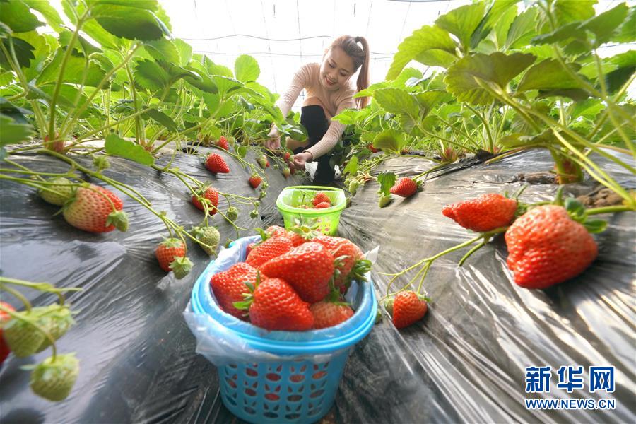 12月20日,游客在唐山市丰润区众浩草莓种植专业合作社大棚内采摘草莓。