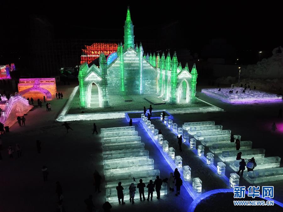 这是哈尔滨冰雪大世界园区内的一处景观(12月23日无人机拍摄)。