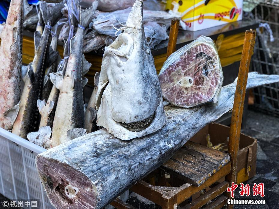 1月12日,黑龙江省佳木斯市抚远东极鱼市,被锯开的冻鱼。