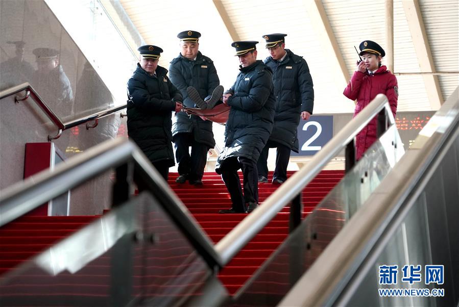 1月16日,鹤壁东站的职工在进行列车下交重伤病旅客应急演练。当日,中国铁路郑州局集团有限公司新乡车务段鹤壁东站组织职工开展服务礼仪、手语等业务培训,并进行非正常情况应急演练,为2019年春运做准备。