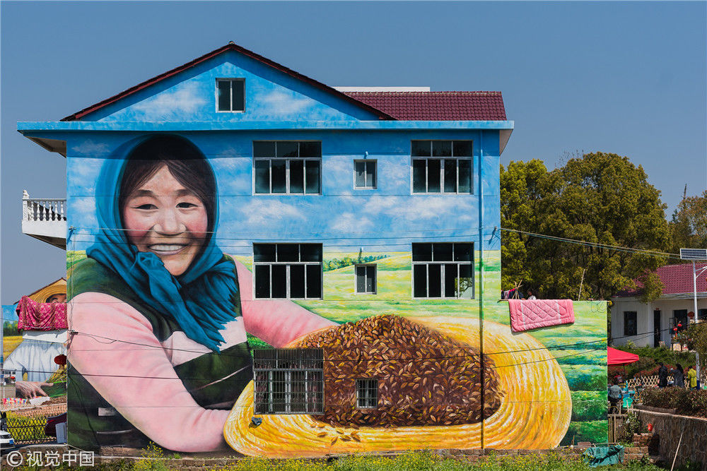 2017年03月27日,江西上饶,皂头镇三联村,一座耕读传家的壁画村落。三联壁画村,走进村落,第一眼,便见到房屋外壁上的巨型壁画,扎着头巾的妇人手捧着种子,播种希望;另一座房屋外壁,农民伯伯手捧稻谷,脸上满是丰收的喜悦。这个村落,邀请从中央美院的走出的专业壁画创作机构柯理沃,由刘璐、田馥榛创作并带领中国壁画精英团队,将房屋外壁当做画布,用五彩斑斓的画笔,绘制巨型3D壁画,诉说着耕读传家的传统,现代农民的生活。在这里,艺术不需要仰视,不再需要朝拜,艺术就在每日生活的院墙间,伴随着泥土的芬芳。白墙黑瓦间,一幅幅色彩斑斓的3D壁画,将乡间的常见的景象画在墙上,也让房屋外墙,成为一道绚烂的风景。巨型的水车、农耕时代的耕牛、现代的收割机,绚烂的巨型壁画,描绘出农村童话般的景象,有“锄禾日当午,汗滴禾下土”的艰辛,更有“稻花香里说丰年,听取蛙声一片”的欣喜。这是我能想到的,农村最美的样子。