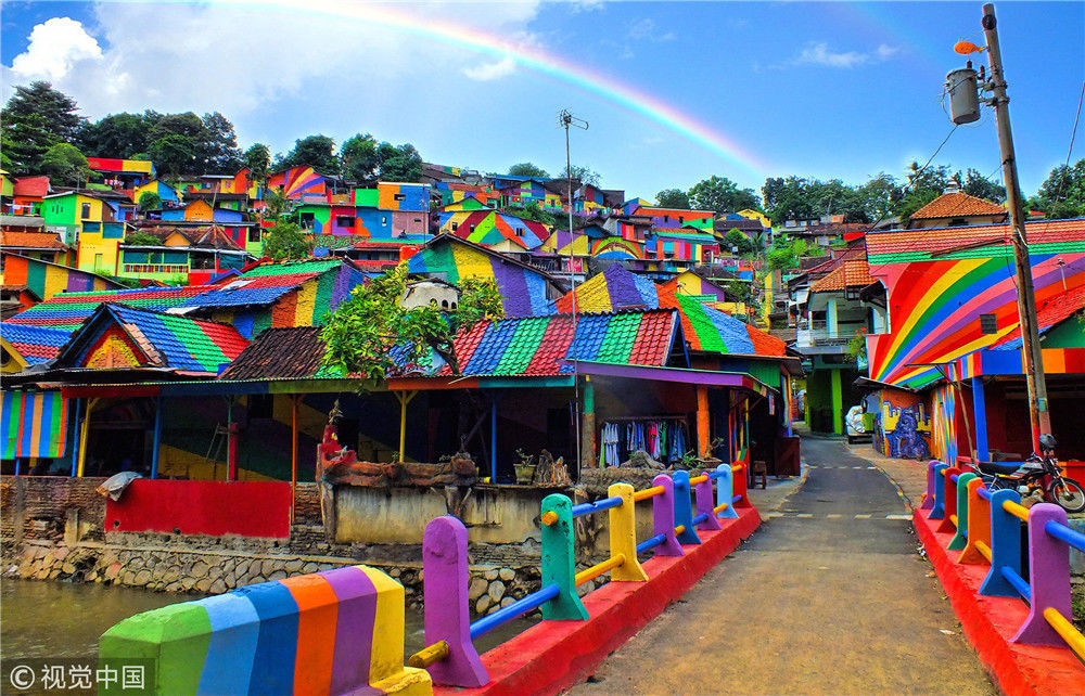 2017年5月17日讯(具体拍摄时间不详),印尼爪哇省兰萨里,当地一个不知名的贫困村,通过当地居民和政府的努力,摇身变成了光彩夺目的“彩虹村”,吸引着世界各地的游客。据悉,当地居民花费了3亿印尼卢比(约合人民币15万元)将村庄改造成了一处旅游胜地,参观者也逐渐增多。 当地居民手工绘制了232座房屋的裸墙,历经一个多月才完成,由此昔日不起眼的小村庄变成了光彩夺目的“彩虹村”,也因此在社交媒体上一炮而红。该地区的文体部门负责人表示一座房子最少有三种颜色。当地人也充分利用这个机会,把当地的特产卖给前去参观的游客。现在230多座房屋已经完成改造。附近三宝垄市的印度尼西亚建筑协会为该村庄提供了人力和物力支持。