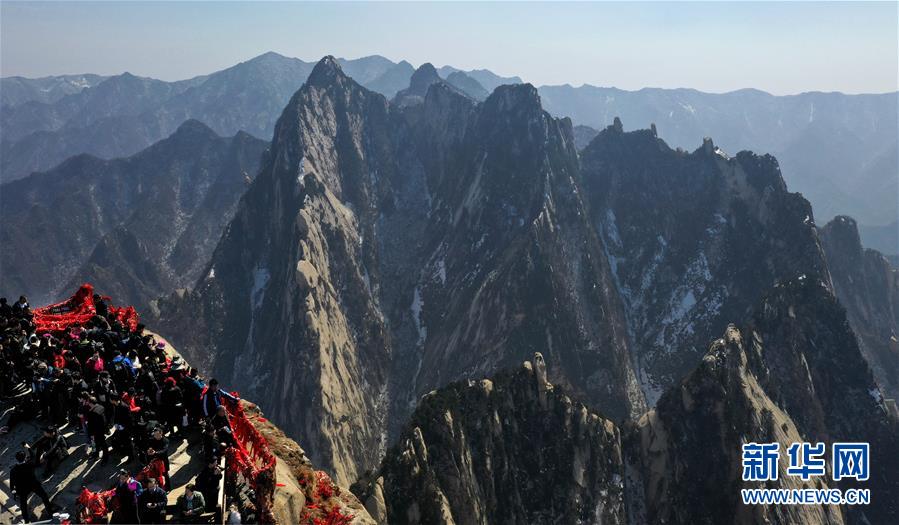 3月9日,游人在华山南峰游览(无人机拍摄)。随着气温回升,陕西著名风景区华山进入旅游旺季。
