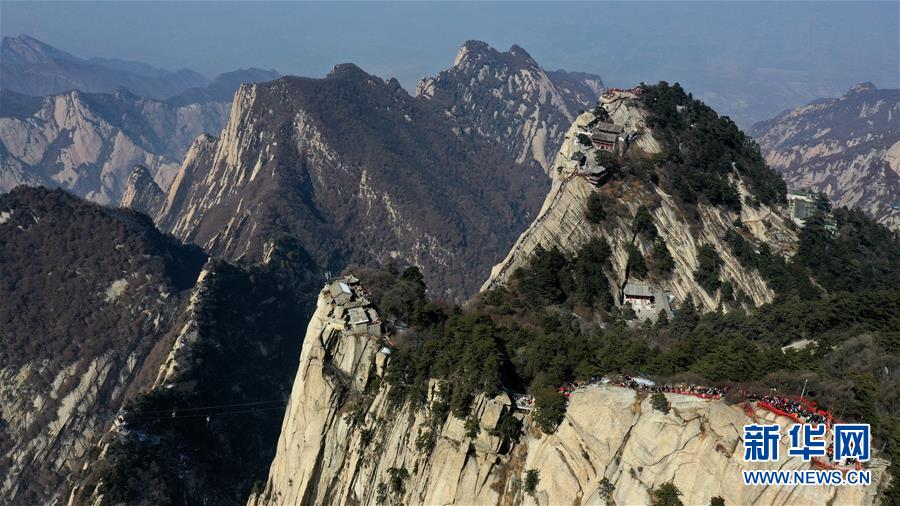 3月9日,游人在华山南峰游览(无人机拍摄)。随着气温回升,陕西著名风景区华山进入旅游旺季。
