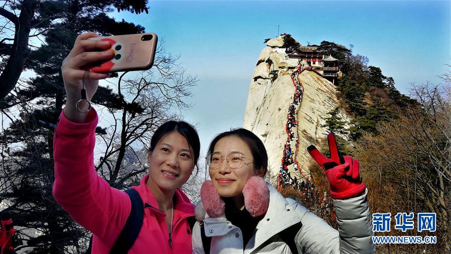 3月9日,游人在华山游览拍照。随着气温回升,陕西著名风景区华山进入旅游旺季。