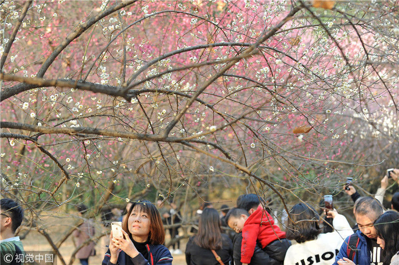 2019年3月10日,武汉大学校园里,早樱和梅花迎春绽放,吸引不少市民前来赏游。