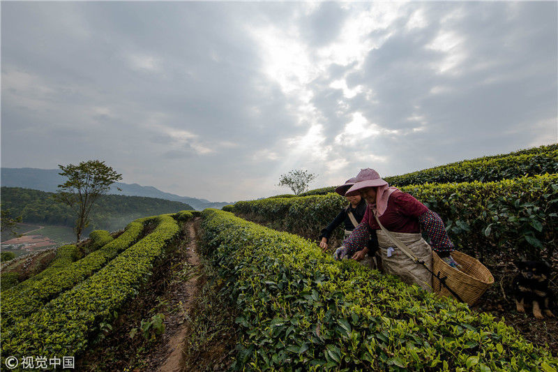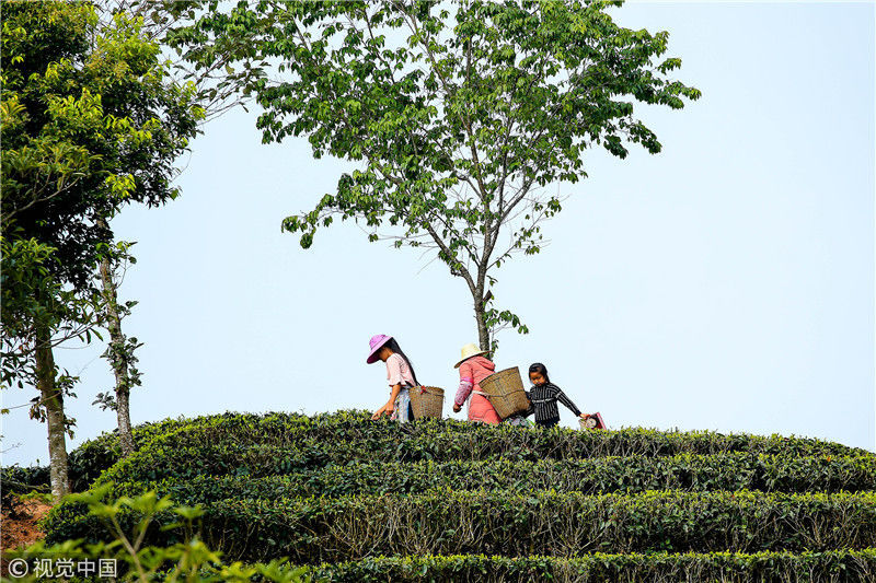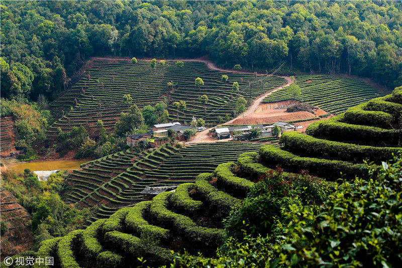 2019年3月9日,云南普洱,营盘山茶园是云南省内最大的连片万亩栽培茶园,位于普洱市东南方向,初春时节,茶园内烟雨缭绕,满目青翠。