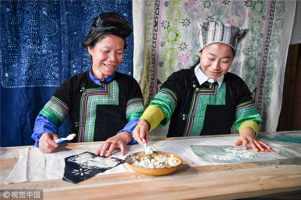 侗族豆染是用黄豆粉、石灰粉、侗家米醋等原料,搅拌制成防染剂,然后用镂空图案模板将防染剂涂到侗家土布上,经过蓝靛靛染、清洗去掉防染剂等工序,形成图案精美、环保耐用的染品。图为2019年3月11日,在贵州省榕江县朗洞镇色边村,侗族妇女石庆芝(左)和女儿田爱吉在查看豆染镂空图案模板。