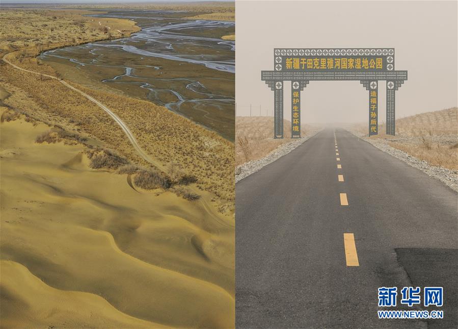 拼版照片:左图为沿着克里雅河通向地处沙漠深处新疆于田县达里雅布依乡的路(3月19日无人机拍摄);右图为从县城通往达里雅布依小镇易地扶贫安置点的柏油路(3月20日摄)。