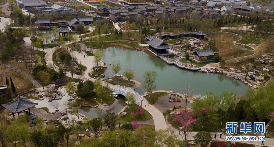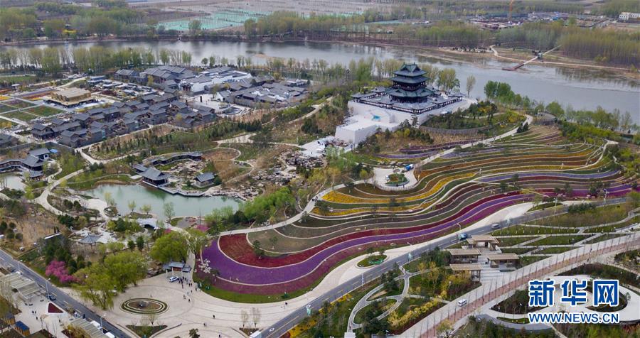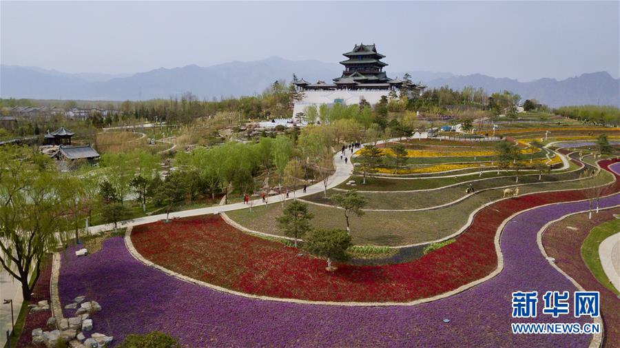 空中俯瞰永宁阁(4月19日无人机拍摄)。随着2019北京世园会临近开幕,世园会园区内的主要建筑已全面完工。群山脚下、妫水之畔,从白天到夜晚,世园会园区仿佛一幅多彩画卷,向世人徐徐展开。新华社记者 侯东涛 摄