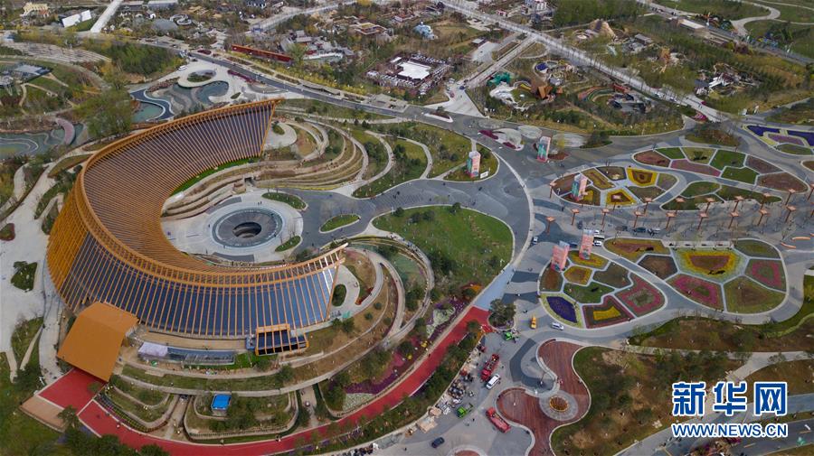 空中俯瞰中国馆(4月18日无人机拍摄)。随着2019北京世园会临近开幕,世园会园区内的主要建筑已全面完工。群山脚下、妫水之畔,从白天到夜晚,世园会园区仿佛一幅多彩画卷,向世人徐徐展开。新华社记者李贺摄