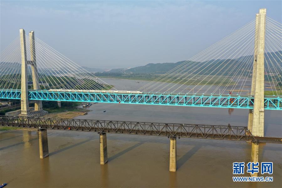 一列高铁列车从新白沙沱长江特大桥上驶过(4月23日无人机拍摄)。4月23日下午5点40分,随着重庆白沙沱长江大桥通行的最后一列客运列车顺利通过,这座“服役”了59年的重庆首座长江大桥进入“退役”倒计时。4月24日后,所有列车将改线经距白沙沱长江大桥约100米的新白沙沱长江特大桥通行,新桥“接力”老桥,运输能力将得到大幅提升。白沙沱长江大桥于1958年开工,1960年通过首趟列车,是继武汉长江大桥之后的第二座长江大桥。