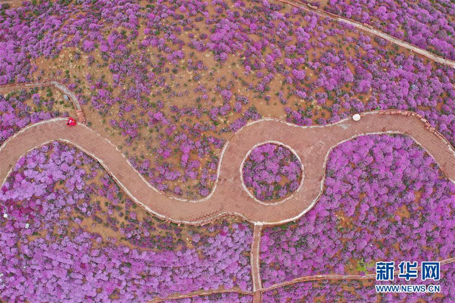 4月24日无人机拍摄的雨花谷景区。近日,河北省迁西县雨花谷景区的芝樱花盛开,吸引游客前来观赏。
