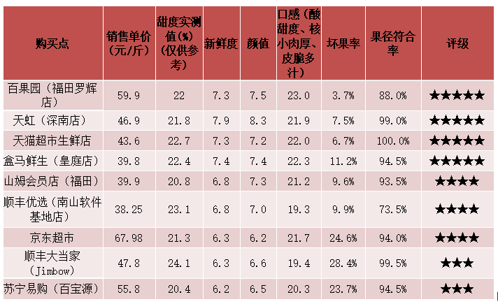 4.实体商超口感排名前三:天虹(深南店)、百果园(福田罗辉店)、山姆会员店(福田)