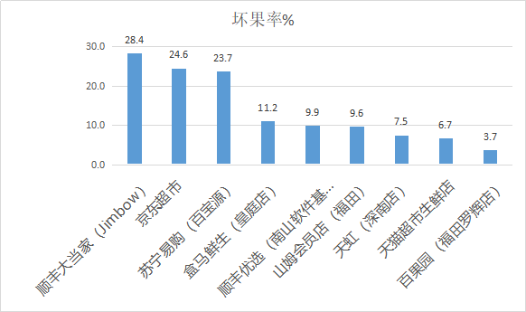 7.坏果率前三:顺丰大当家(Jimbow)、京东超市、苏宁易购(百宝源)