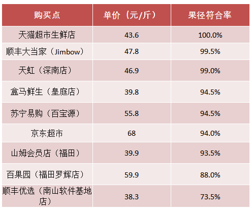 1.坏果率:同一等级车厘子(双JJ)购买的渠道不同,本次价格范围在38.3元/斤-68元/斤之间。但坏果率高会直接提升实际的购买单价。结果表明:线上购买的车厘子可能因运输原因,坏果率明显较高,顺丰大当家(Jimbow店铺)、京东超市、苏宁易购(百宝源店铺)坏果率最高,分别是28.4%、24.6%、23.7%。而坏果率较低的分别是百果园(新沙店)3.7%、天猫超市生鲜店6.7%、天虹(深南店)7.5%。其中5家电商均已据根据坏果情况按比例赔付。