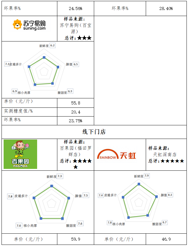 6.实体商超综合评级五星:百果园(福田罗辉店)、天虹(深南店)