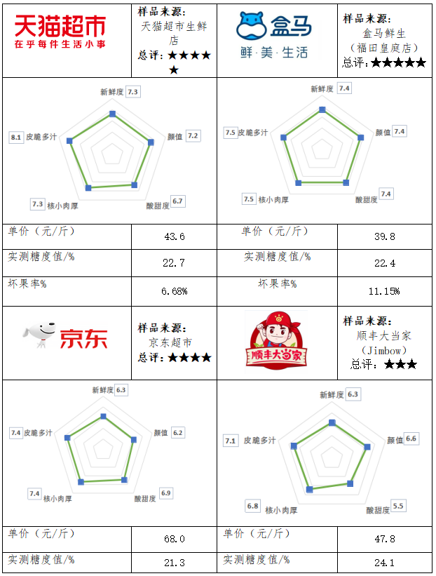 3.电商平台口感排名前三:盒马鲜生(皇庭店)、天猫超市生鲜店、京东超市