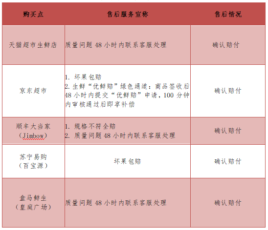 电商平台的售后处理情况普遍较好。因此,消费者在网上购买生鲜食品前,要注意平台商家的承诺,在出现质量问题的时候,注意及时联系平台售后处理,维护自身合法权益。