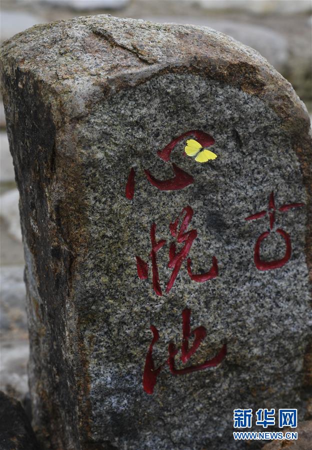 6月1日,一只蝴蝶落在香山古驿道的石碑上。