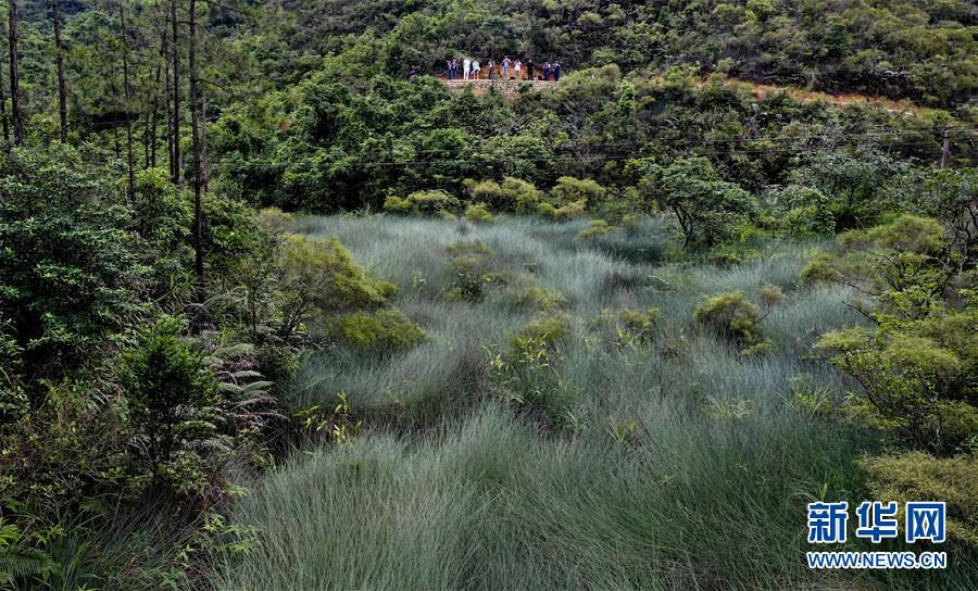6月1日,游人在香山古驿道旁欣赏富有野趣的“烟波潮涌”景色(无人机拍摄)。