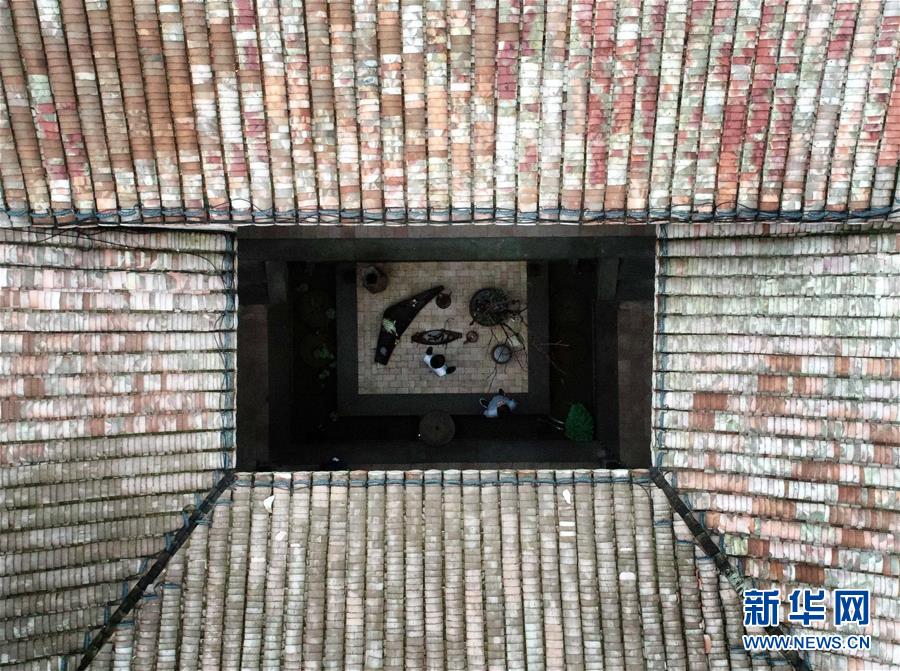 在万载古城的一家以手工艺品为主题的民宿内,住客在天井欣赏手工艺品(6月6日无人机拍摄)。近年来,江西省万载县大力推进文旅融合,充分利用万载古城祠堂集群优势,以特色民宿为依托,打造以传统手工艺、文化创意、美食餐饮、休闲娱乐为主的旅游文化,吸引游客“愿留下”“尽兴玩”。