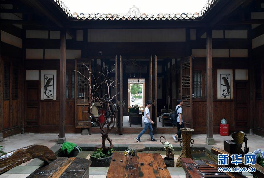游客从万载古城一家特色民宿的前院走过(6月6日摄)。