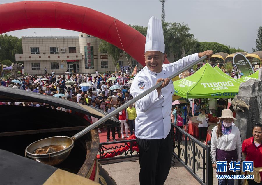 6月22日,在博斯腾湖开湖仪式上,一名厨师舀起刚刚烹制好的鱼。