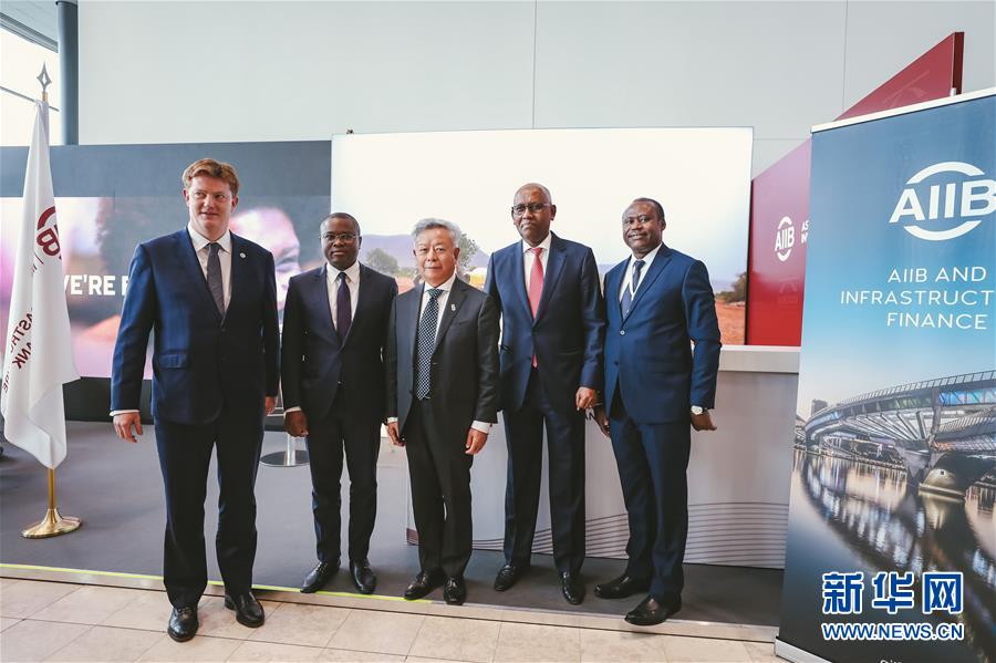 7月13日,亚投行行长金立群(中)与新加入亚投行的贝宁(左二)、吉布提(右二)和卢旺达(右一)代表合影。