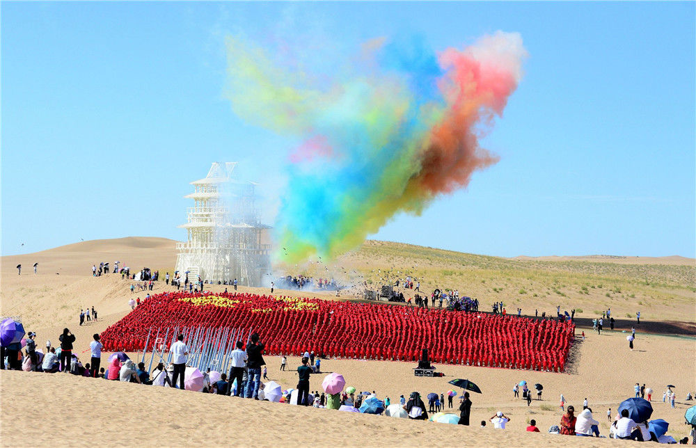 幕式上,民勤县为入展艺术家颁发了收藏证书,各位艺术家、参会嘉宾参加了留手印、参观摄影展及拍卖等活动。民勤县近万名志愿者齐唱《我和我的祖国》,将现场气氛推向高潮。