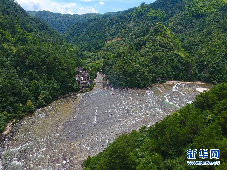 福建省屏南县白水洋景区浅水广场上游客在戏水避暑(7月26日无人机拍摄)。