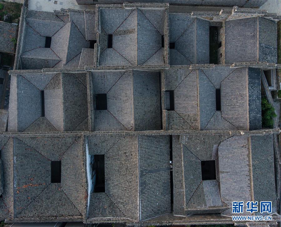 俯瞰安义县古村落罗田村多达十来个天井的士大夫第宅院(8月8日无人机拍摄)。