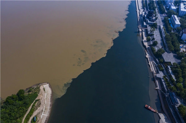 长江清江现壮观分界线 黄绿交汇泾渭分明