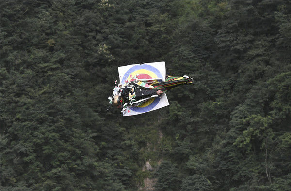 2019年9月3日,湖南张家界,翼装飞行运动员在海拔1400余米的天门山玉壶峰起跳台进行试飞训练,惊险刺激的飞行吸引了众多游客驻足观看。2019年第八届翼装飞行世锦赛将于9月5日至8月在湖南张家界天门山景区正式开赛,届时来自11个国家的16名顶级翼装飞行运动员将展开激烈的角逐。
