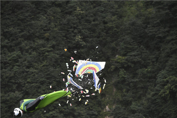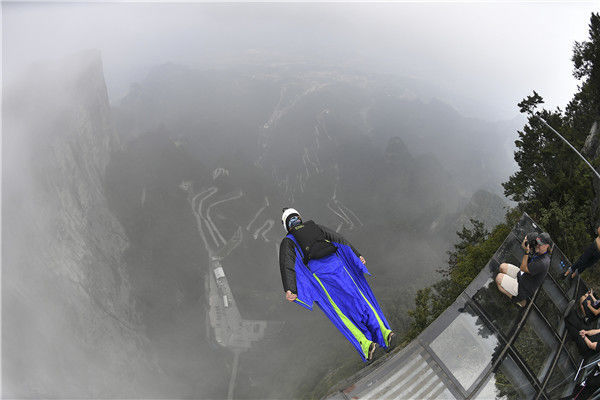 2019年9月3日,湖南张家界,翼装飞行运动员在海拔1400余米的天门山玉壶峰起跳台进行试飞训练,惊险刺激的飞行吸引了众多游客驻足观看。