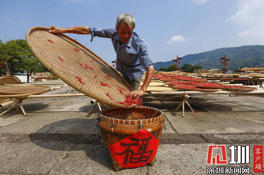 秋天,是收获的季节。安徽省黄山市呈坎古村村民将收获归仓的玉米、黄豆、红辣椒等农作物果实因地制宜晾晒,在古村晒场上描绘出一幅丰收晒秋图。