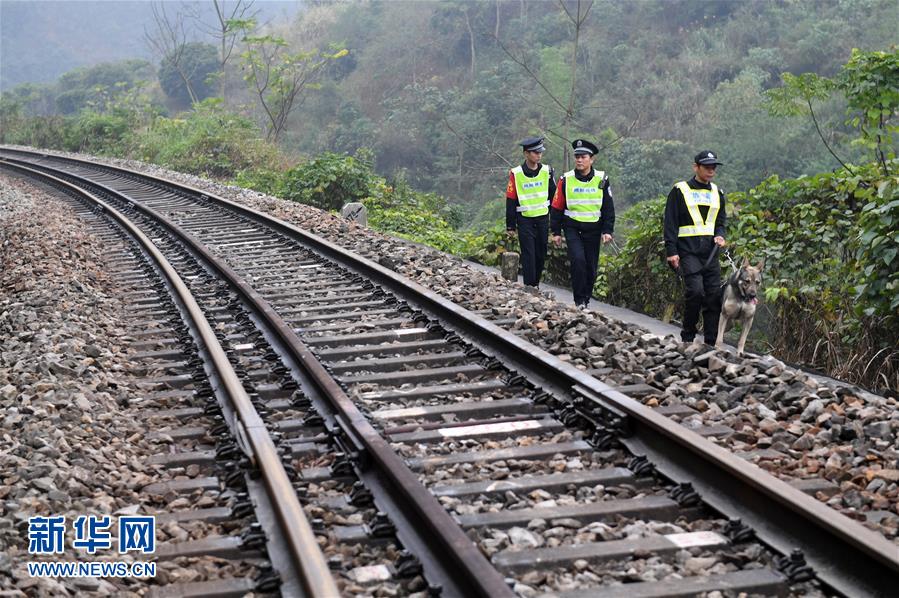1月21日,陆日峰(中)和同事在铁路线上巡线。