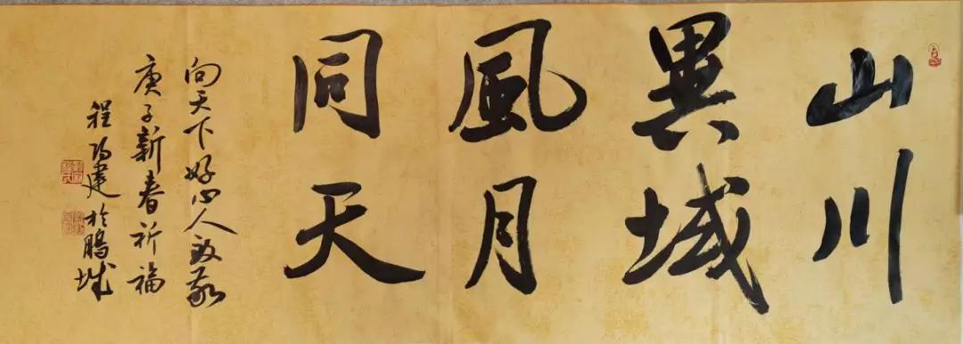 款文:眼下正值举国上下奋力抗疫之际,万千仁爱故事频传,邻邦友人纷纷援助:山川异域,风月同天。岂曰无衣,与子同裳。深为感动此等大爱精神所动,拟两句曰:长城有界,大爱无疆赞之。庚子初月赖金水。