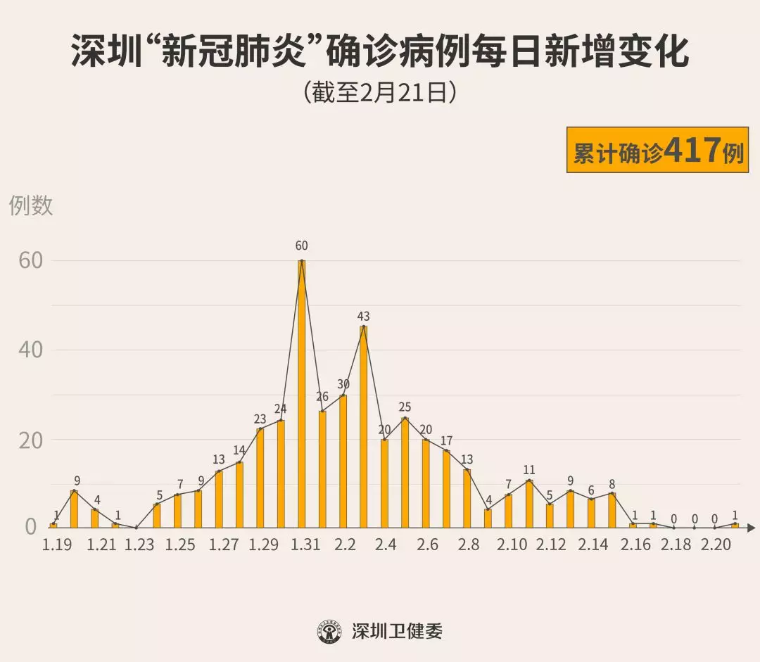 截至2月21日24时,深圳累计报告“新冠肺炎”确诊病例417例。2月21日当天全市新增确诊病例1例(个案详情今晚公布)。