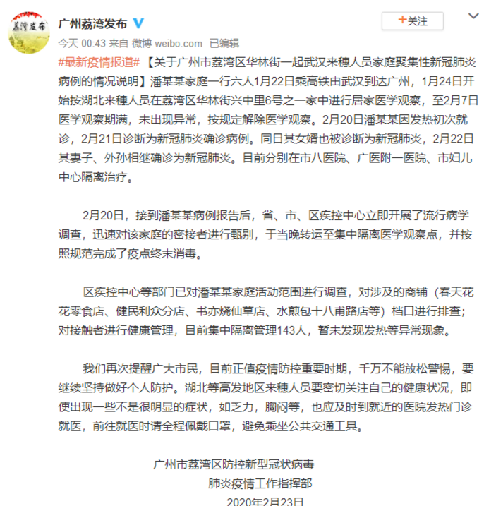 见圳客户端.深圳新闻网2020年2月24日讯据广州荔湾发布消息,潘某某家庭一行六人1月22日乘高铁由武汉到达广州,1月24日开始按湖北来穗人员在荔湾区华林街兴中里6号之一家中进行居家医学观察,至2月7日医学观察期满,未出现异常,按规定解除医学观察。2月20日潘某某因发热初次就诊,2月21日诊断为新冠肺炎确诊病例。同日其女婿也被诊断为新冠肺炎,2月22日其妻子、外孙相继确诊为新冠肺炎。目前分别在市八医院、广医附一医院、市妇儿中心隔离治疗。
