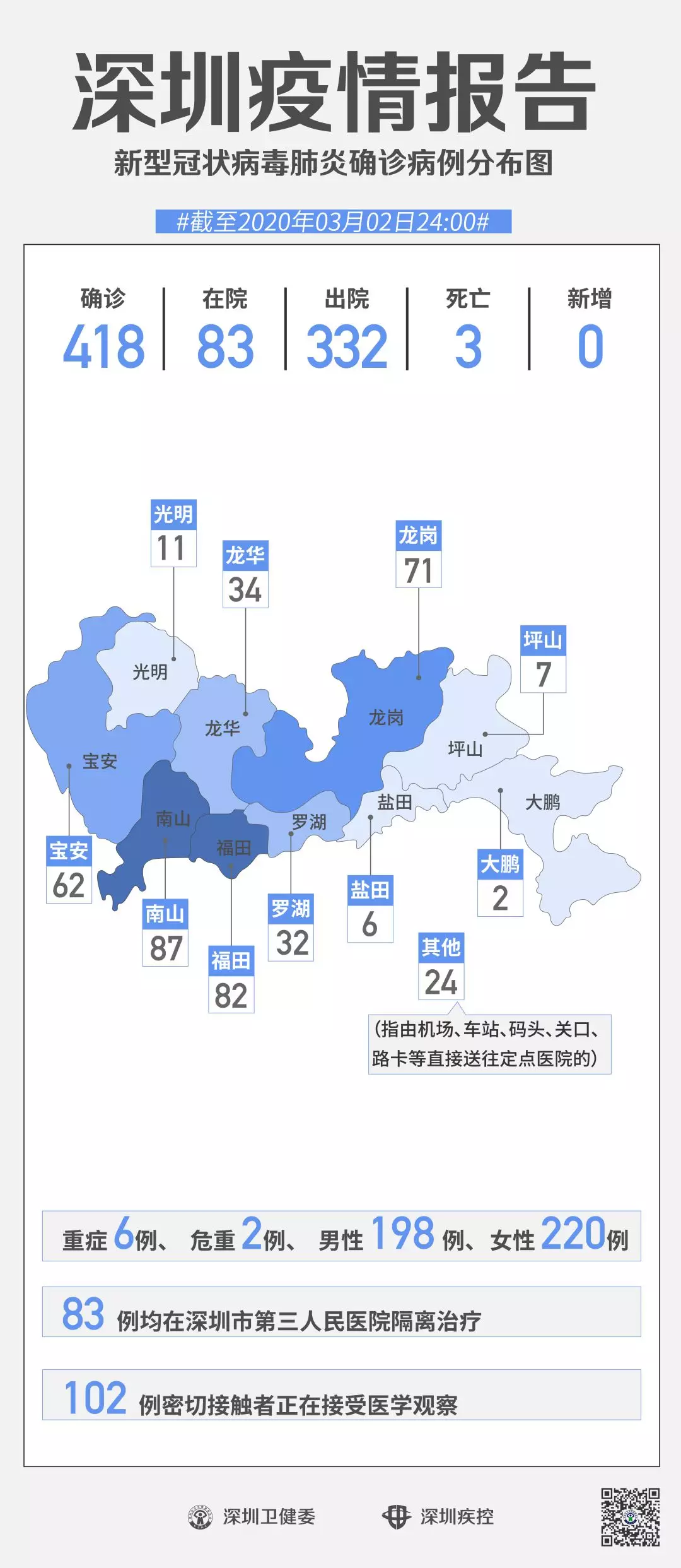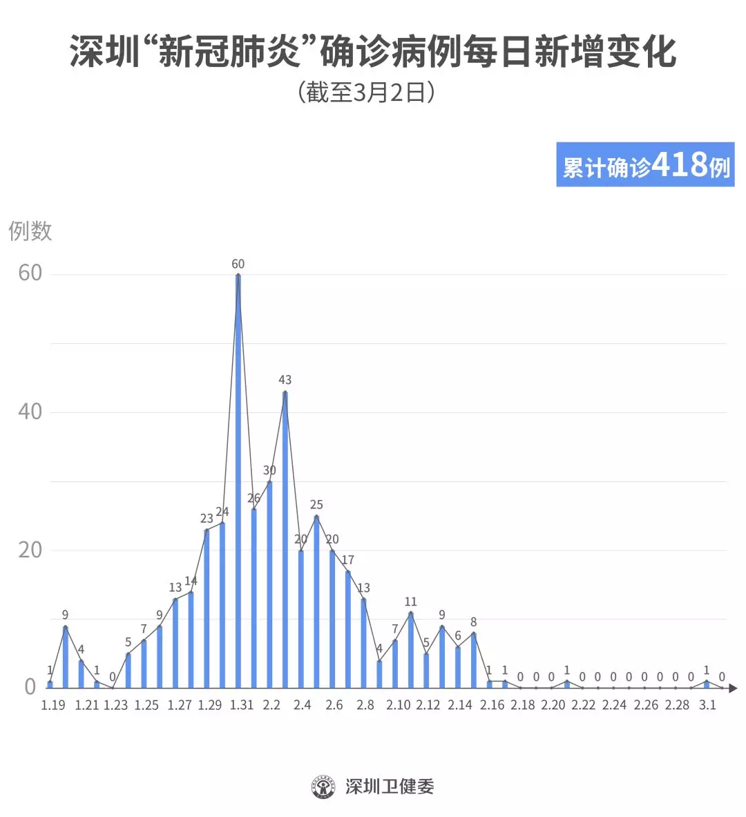 见圳客户端·深圳新闻网2020年3月3日讯截至3月2日24时,深圳累计报告“新冠肺炎”确诊病例418例。3月2日当天全市无新增确诊病例,当天出院病例12例(从2月26日起不再公布出院个案)。