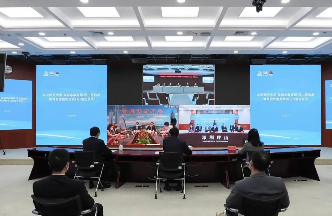 深圳新闻网坪山讯 3月6日,东北师范大学、深圳市教育局、坪山区政府教育合作项目云签约仪式在深圳、长春两地连线举行。东北师范大学校长刘益春、副校长常青,深圳市教育局局长陈秋明、副局长许建领,坪山区委书记陶永欣,区长李勇,区政协副主席、区教育局局长彭尧等出席签约仪式。