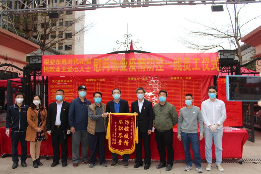 现场由此次捐款捐物倡议书的发起人代表亲手为80余名物业一线工作人员送上业主的爱心与关怀,仪式上,爱心业主们还为小区物业赠送了致谢的锦旗。