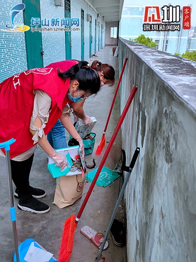 活动中,义工们戴着口罩,身穿“红马甲”,手持扫帚、喷洒壶对员工宿舍等场所进行全面清扫和消毒,特别是卫生间、扶手、垃圾桶等细菌病毒容易滋生处。