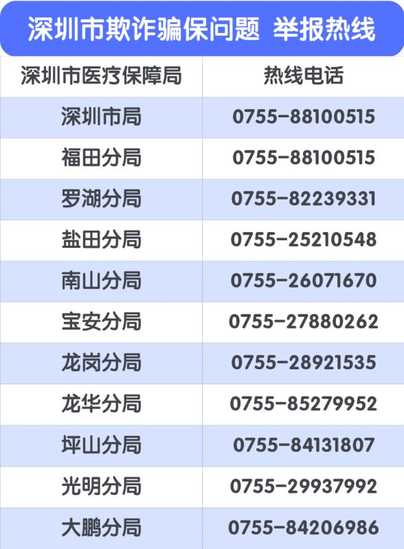 市医保局已在深圳市各区设立投诉举报电话,欢迎广大市民共同参与医保基金监督管理。市民可通过实名举报和匿名举报方式检举、揭发欺诈骗保行为,经查证属实的,将根据《深圳市欺诈骗取医疗保障基金行为举报奖励实施细则(试行)》对举报人予以奖励,奖金最高可达10万元!(记者庄瑞玉)