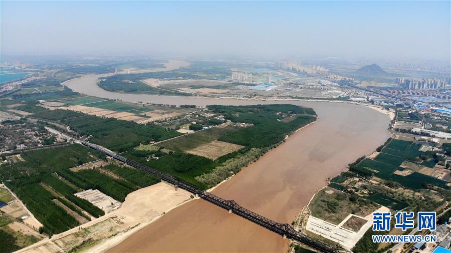 4月24日在山东济南拍摄的黄河景色(无人机照片)。春暖花开的时节,济南黄河两岸春风送绿,大河、绿植与城市构成了一幅春的画卷。